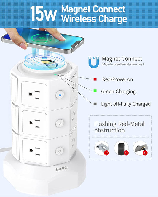 Power Strip Tower, Surge Protector Tower with 15W Magnetic Wireless Charger, 1050J, 13A Charging Station with 12 AC Outlets & 6 USB Ports, 6.5Ft Extension Cord for Home Office, White